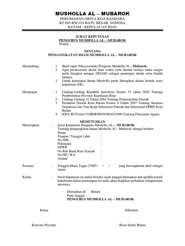 Batam kota ii pelindung / penasehat : Pramono daniel faisal, sh ketua : Mui kota balikpapan dewan masjid indonesia kota balikpapan b. Kakandepag kota palangka raya 7. Dan itu malah akan membuat panitia menjadi tidak mudah dan bebas dalam bekerja. Untuk aplikasinya, penamaan bisa disesuaikan yang lebih mudah penyebutan dan pengaplikasiannya. Sebabnya jika terlalu baku maka khawatir pekerjaan dan komunikasinya akan terlihat kaku. Slamet bidang penelitian dan pengembangan bpk. Susunan panitia pembangunan masjid bisanya tidak baku, tergantung takmir masjid yang menentukan bagian apa saja yang akan diamanahkan oleh warganya. Pengurus takmir masjid adalah sekelompok orang yang dipilih melalui musyawarah dan mufakat, yang bertanggung jawab memakmurkan masjid. Yudiyanto pengurus musholla ketua sekretaris sugiyatno paisih 4. Sebab kami akan terus memberikan contoh sk terbaik untuk anda. Contoh sk pengurus masjid muhammadiyah ilmusosial id.